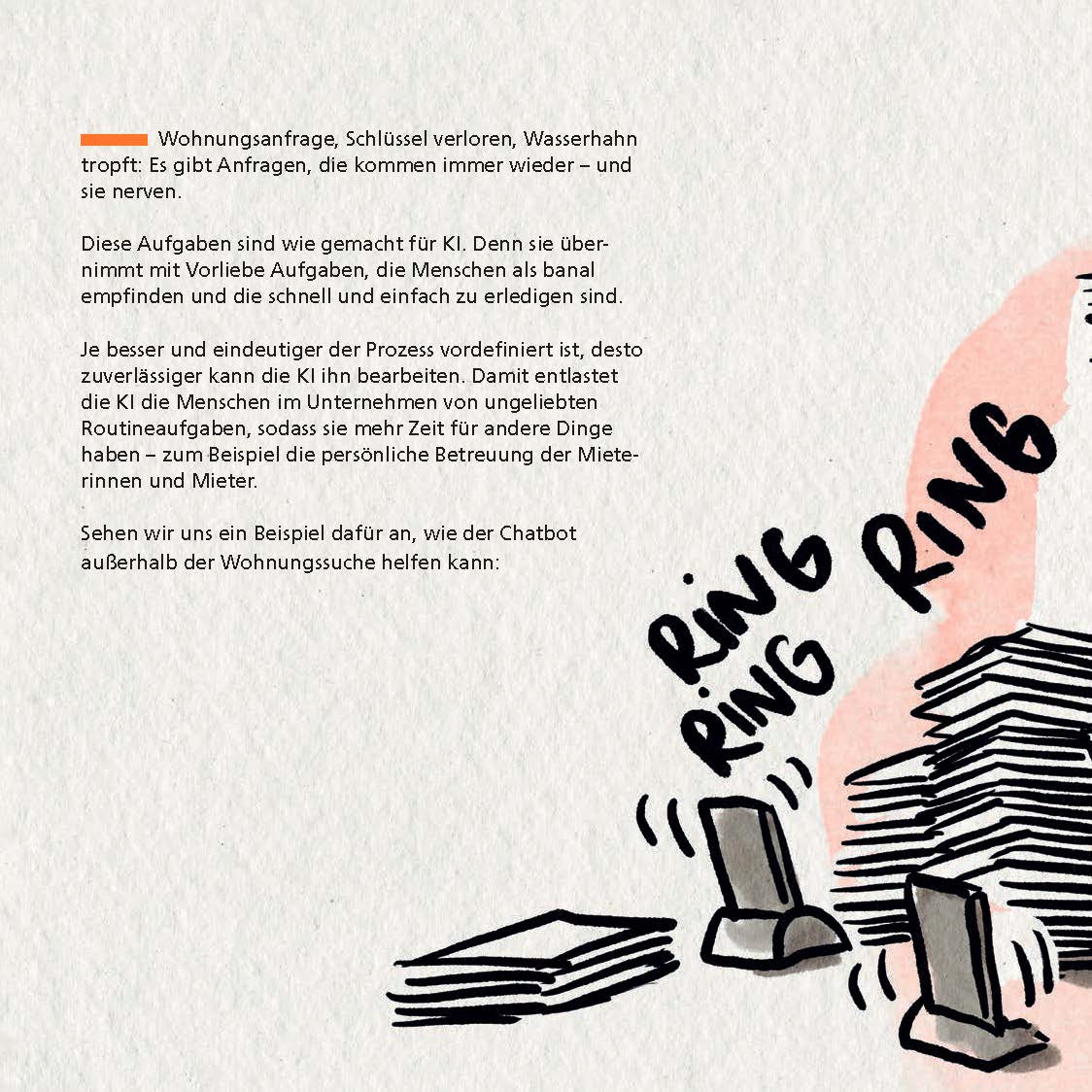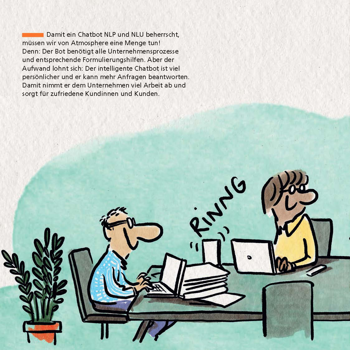 Der Chatbot arbeitet Ihren Mitarbeitern zu. Das heißt, er nimmt Anliegen auf, strukturiert sie vor und gibt sie bei Bedarf gut vorbereitet an Ihre Mitarbeiter weiter. Diese können den Vorgang selbst weiter bearbeiten oder die Kontrolle an den Chatbot zurückgeben.