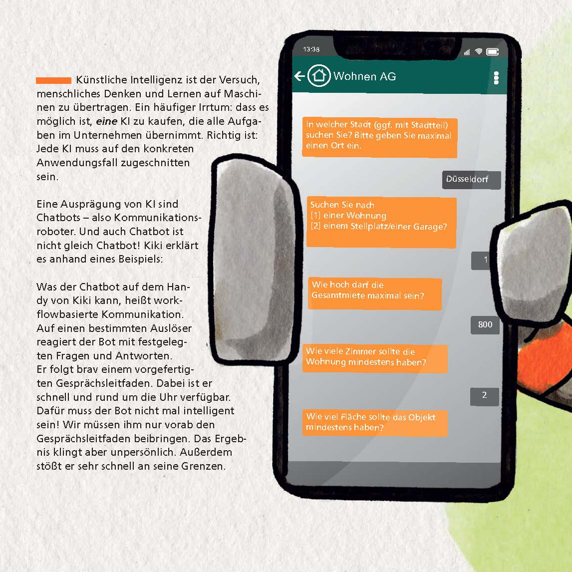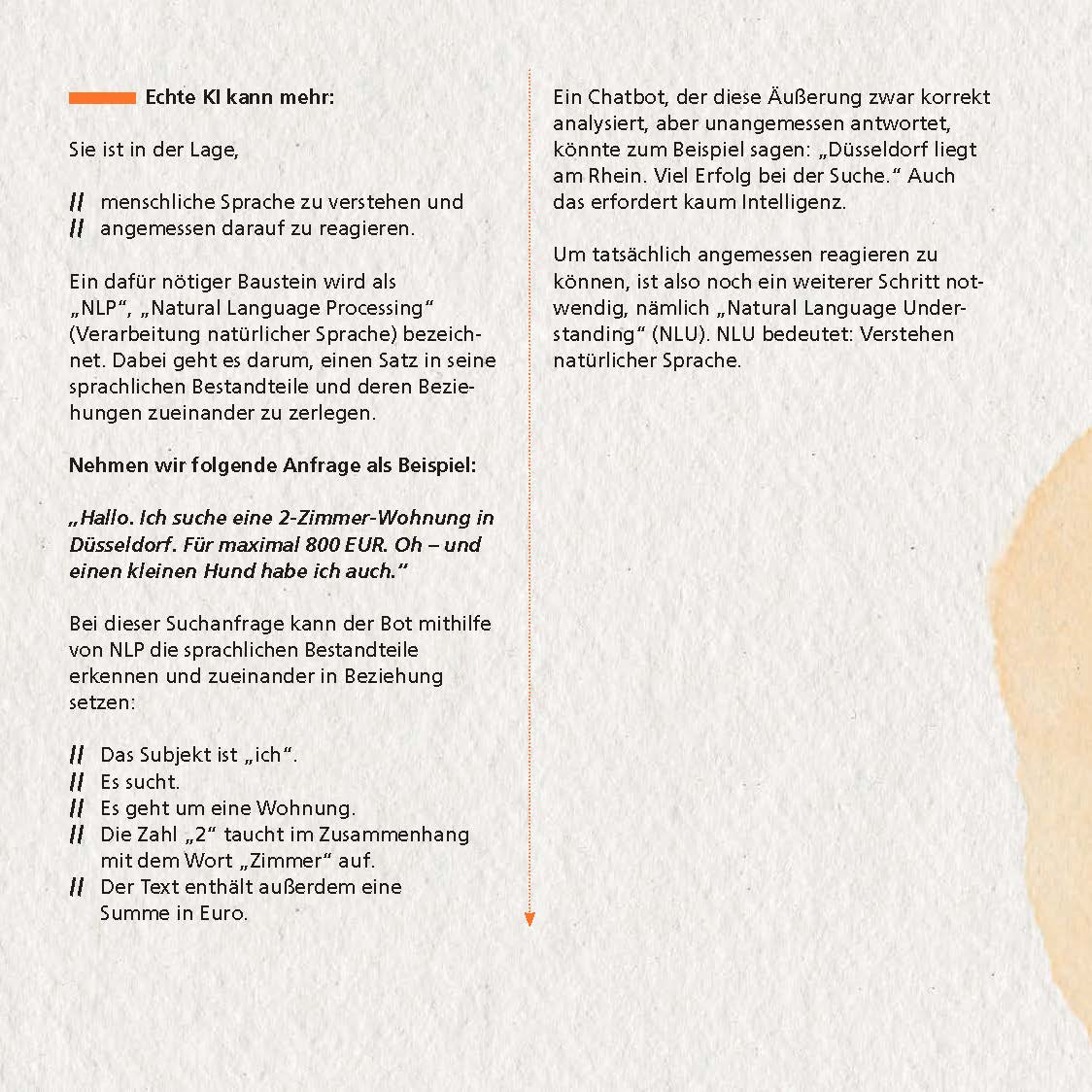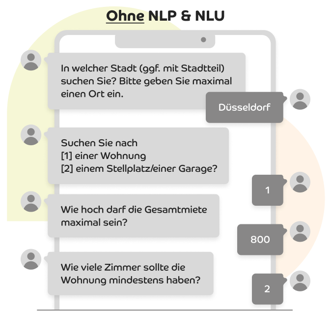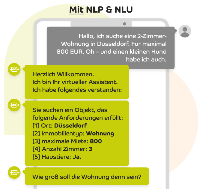 Zur Sicherheit stellt der Chatbot eine Rückfrage, z.B. “Sie suchen eine Wohnung in Düsseldorf? Ist das richtig?” Wenn die Antwort nein lautet, erfolgt die Ausgabe des Menüs. So kann der Kunde dann die korrekten Informationen problemlos übermitteln.