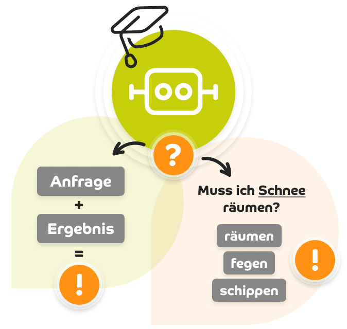 Falls unser System eine Kundenanfrage nicht sofort versteht, leitet es die Kunden Schritt für Schritt durch den Prozess. Danach analysiert es per Machine Learning die erste Nachricht und das Ergebnis. Es fügt entsprechende “Indikatoren” hinzu und kann dann ähnliche Anfragen sofort zuordnen.
