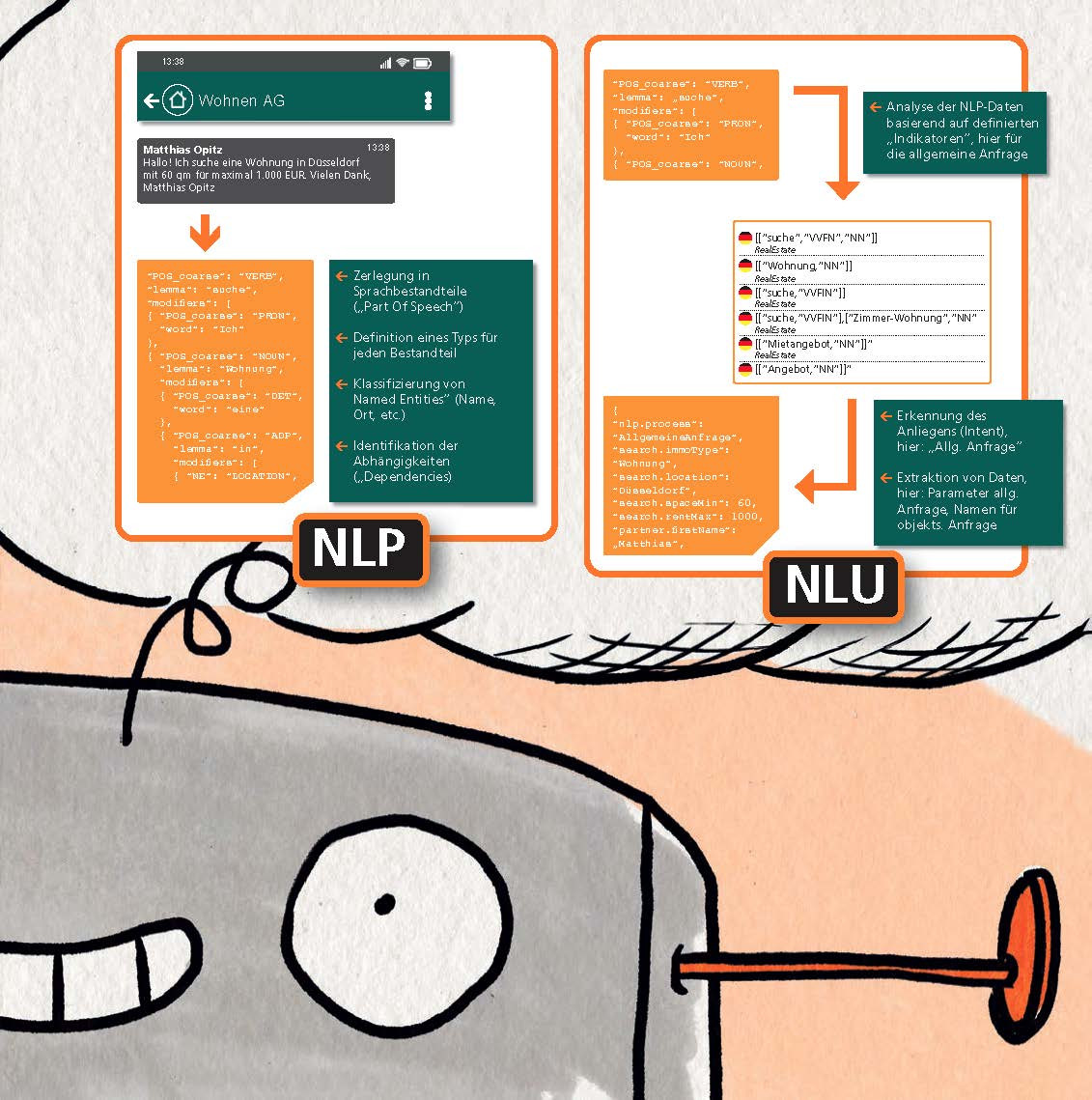 KiKi interpretiert die Anliegen der Kunden, indem sie sie in sprachliche Bestandteile zerlegt und mit Hilfe von definierten Indikatoren analysiert. So erkennt sie, welches Ziel die Frage verfolgt und kann den entsprechenden Prozess einleiten.